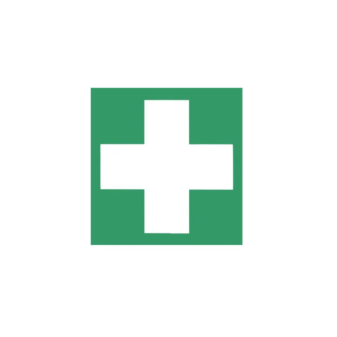 100×100 mm lipdukas „Pirmoji pagalba” –  žymi pirmosios pagalbos rinkinio vietą.
